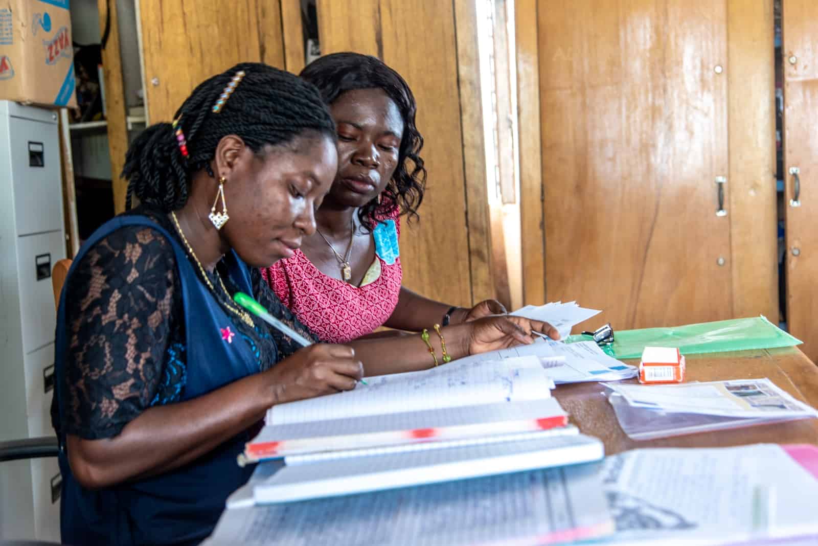 At the center, Lorlor meets Emmanuella, the collation officer, who has logged every letter. Lorlor double checks the log and signs before Emmanuella hands over the packages to her.